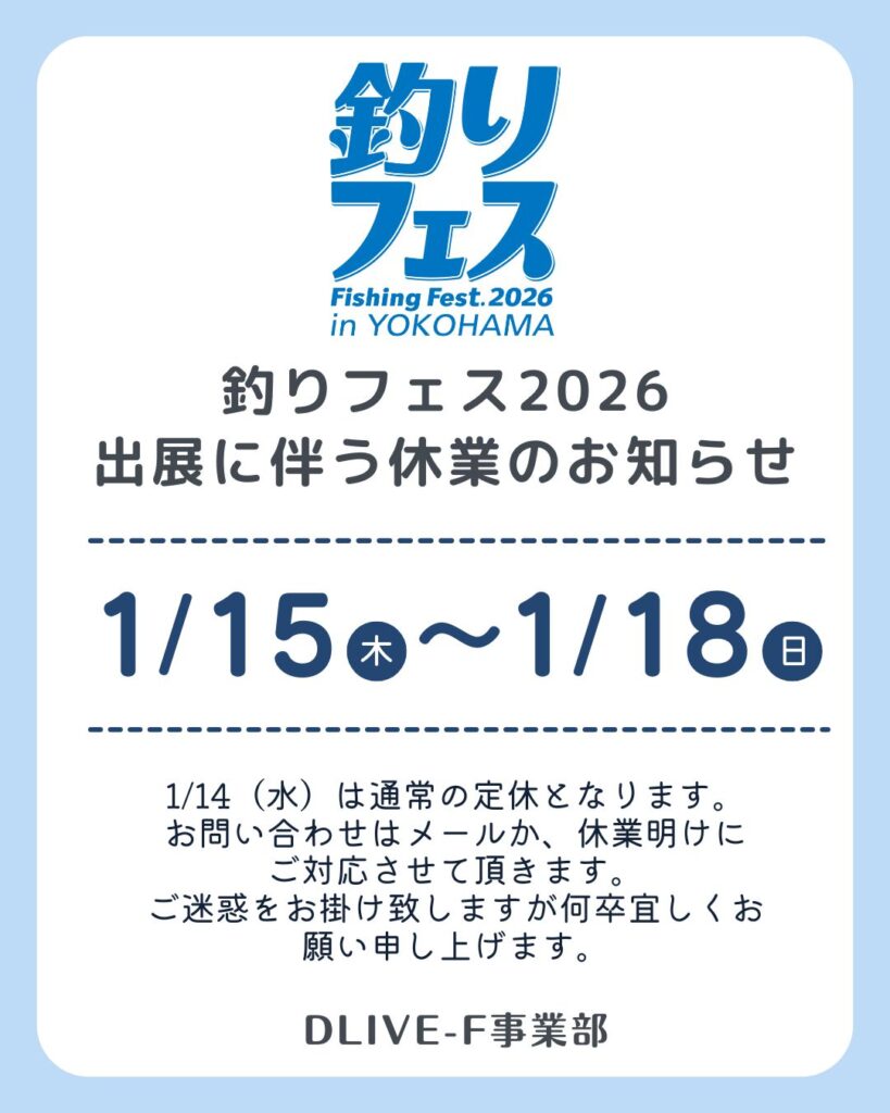 以上の日程を釣りフェス2026 in YOKOHAMA 出展に伴い休業とさせて頂きます。