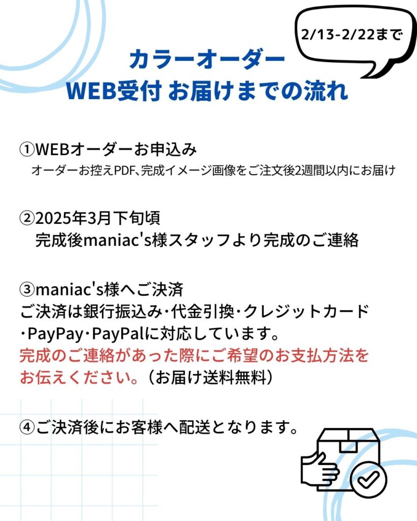 完成後に弊社からmaniac’s様へ発送、maniac’s様のスタッフよりお客様へご確認のご連絡を致します。